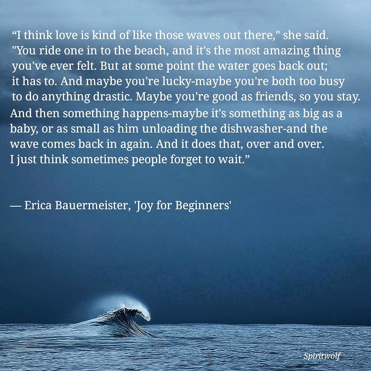 “I think love is kind of like those waves out there,” she said. “You ride one in to the beach, and it’s the most amazing thing you’ve ever felt. But at some point the water goes back out; it has to. And maybe you’re lucky-maybe you’re both too busy to do anything drastic. Maybe you’re good as friends, so you stay. And then something happens-maybe it’s something as big as a baby, or as small as him unloading the dishwasher-and the wave comes back in again. And it does that, over and over. I just think sometimes people forget to wait.”